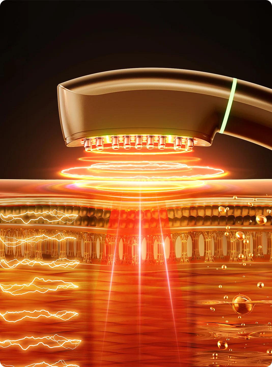 A facial golden pivot and 11cm² large electric field deliver immediate soft tissue tightening and reset facial contours for a visibly firmer, youthful V-shape.